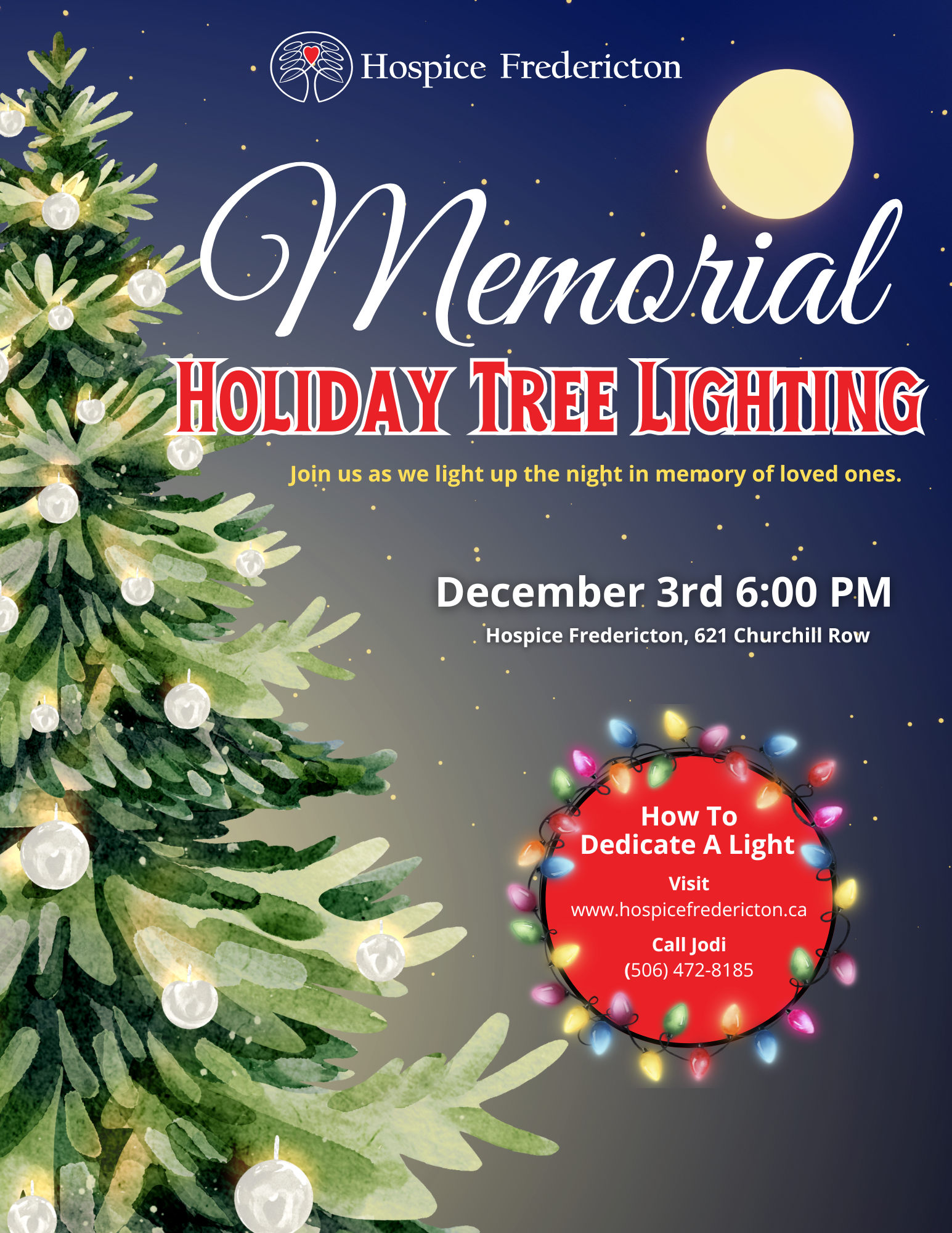 Each light on the tree will signify a donation made to Hospice Fredericton in memory of a loved one. If you’d like to donate to this campaign, you can purchase lights or make a general donation – every dollar made will be put towards the programs and services that Hospice Fredericton has to offer.