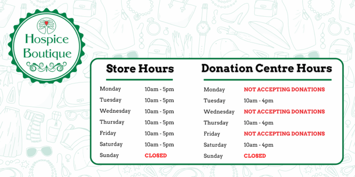 All donated items sold are tracked yearlong and the donor receives a charitable tax receipt for the accumulated total amount of $20 and above. Receipts will be issued for income tax purposes. By donating items to the Hospice Boutique, the donor agrees to release the items. Our staff and volunteers will carefully select the items that are appropriate for sale.